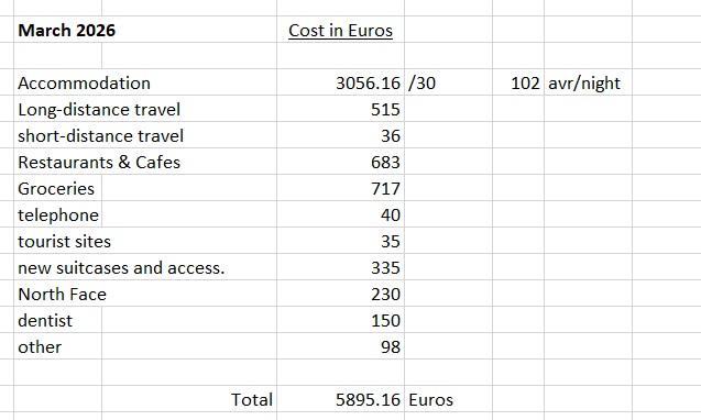 After 2 months of fast travelling, especially in March, we look forward to slowing down and having a couple of bases. Our costs will also come down dramatically in April: surprisingly accommodation costs are less in Southern France than they are in Northern Spain and that’s compounded by longer stays which brings down the cost even more. In fact, our average accommodation cost in April will come out to just under 64 Euros/night which is even less than what we paid in February in Andalusia. I’ll be covering that in detail in my April summary.